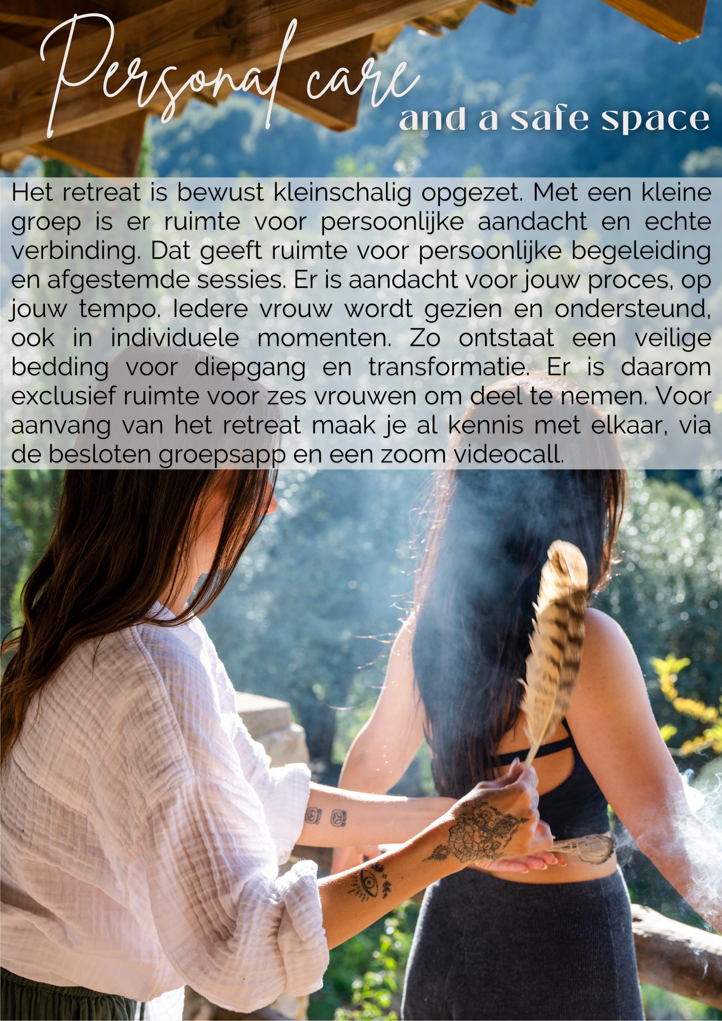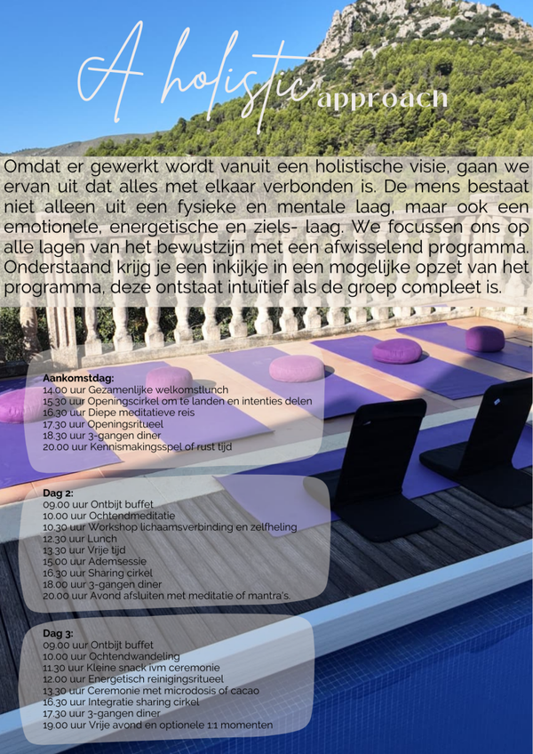 Het retreat is kleinschalig, maximaal 6 vrouwen kunnen deelnemen. Zodat we echt de diepte in kunnen en je veel persoonlijke aandacht ontvangt. Voor we vertrekken zullen we online kennismaken via de besloten whatsappgroep en een videocall via zoom.