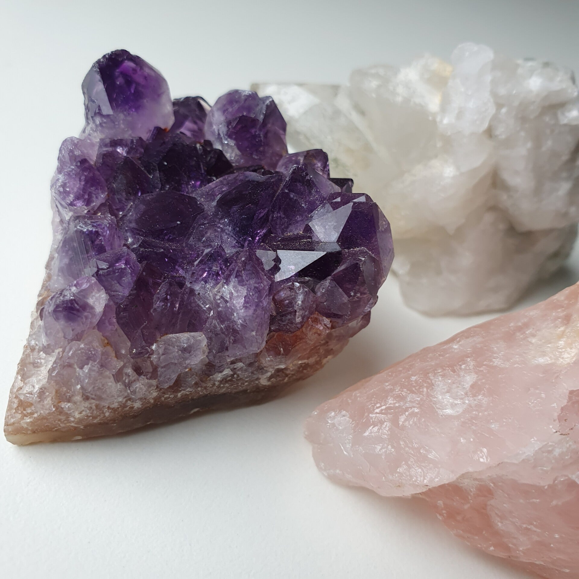 De gouden driehoek bestaat uit amethist, bergkristal en rozekwarts. Deze brengen harmonie, balans, liefde, positieve energie en een goede nachtrust.